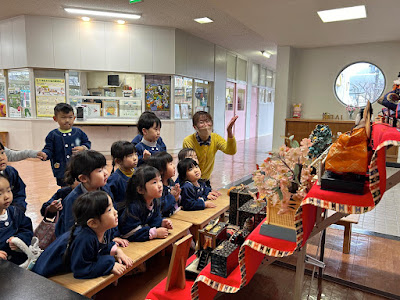 学年やクラスごとに見学に来て、先生からお話を聞いたり、一緒にひな祭りのお歌を歌ったりしました。